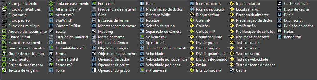 A categoria Fluxos fornece atalhos para criar diferentes tipos de configurações de sistema de partícula inicial. Para usar um fluxo, basta arrastá-lo do Depósito para a janela principal da Vista de partículas. Os fluxos disponíveis estão listados no final deste tópico.