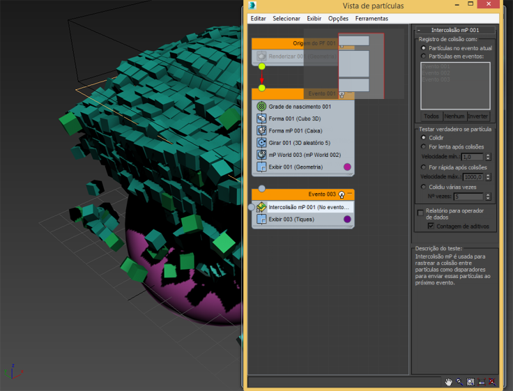 O teste mParticles InterCollision registra a colisão entre partículas, logo redireciona as partículas (de acordo com as informações da colisão) para outros eventos.