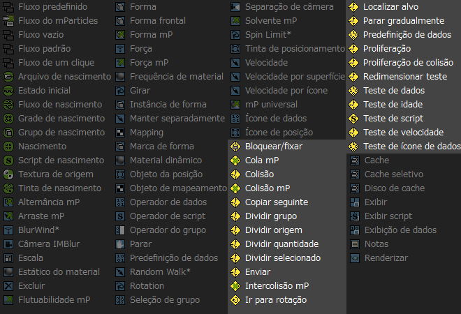 Alguns testes também podem servir como operadores, no sentido em que eles contêm parâmetros que modificam o comportamento das partículas. Se você não conectar um teste a outro evento, ele funciona somente como um operador. O aspecto do teste não afeta o fluxo de partículas.