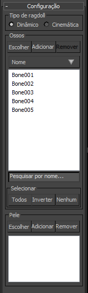Ao selecionar o auxiliar, a respectiva interface surge no painel Modificar. Na implementação Configuração, a lista Ossos mostra todos os ossos associados ao Ragdoll. Além disso, se o personagem tiver pele, a(s) malha(s) de pele são exibidas na lista Pele.