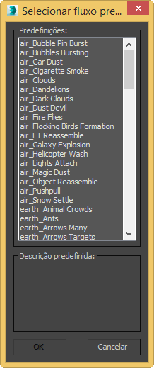 Para adicionar um Fluxo Predefinido, arraste esse Fluxo para o mapa de eventos na Vista de Partículas. A caixa de diálogos Selecionar Fluxo Predefinido se abre. Realce uma predefinição e, a seguir, clique em OK, ou simplesmente clique duas vezes em um nome predefinido.