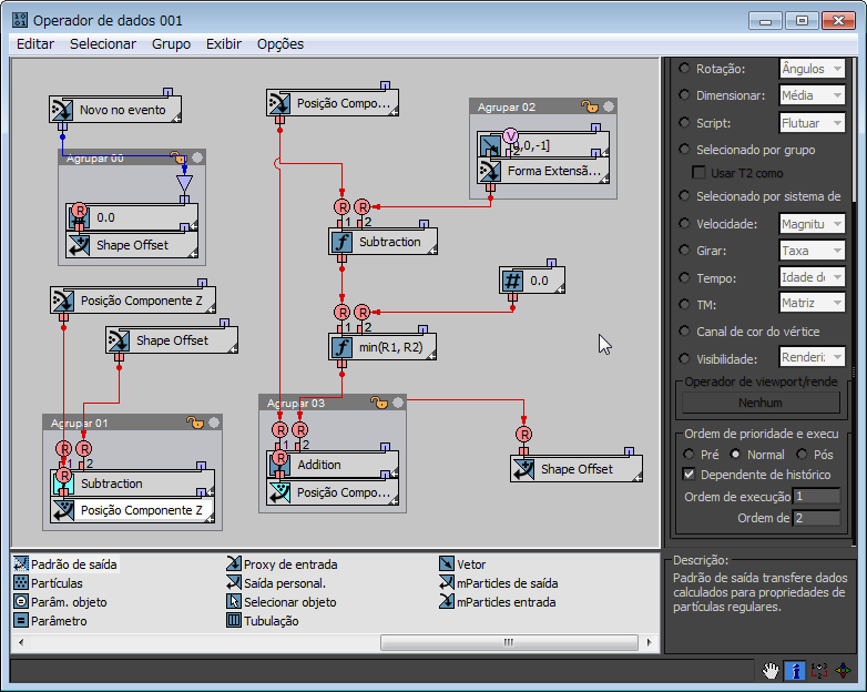 Os suboperdores de saída com o mesmo valor da Ordem de Execução lida com os mesmos dados de entrada. Quando o valor da Ordem de Execução for o mesmo, o valor da Ordem de Prioridade define a ordem na qual os Suboperadores de Saída extraem os dados de entrada. Somente depois que todos os dados forem obtidos, eles são aplicados às propriedades de partículas.