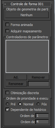 Utilize controle de forma para atribuir formas às partículas. É mais flexível que o operador da instância de forma porque permite o controle direto dos parâmetros de forma para cada partícula. O subpoerador do Controle de Forma pode ver todos os parâmetros do modificador e formas. A única restrição é que não é possível ter mais de nove valores de entrada (tempo mais até oito valores de controlador) e o material deve ser definido por meio de suboperadores, por exemplo, por Herança de Material.