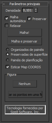 - Superfície preservada Quando as opções Malha automática e Preservar estão ativadas ou ao clicar em Aplicar malha e Preservar, o Criador de vestuário tira uma foto instantânea da malha no topo da pilha (onde a opção Tecido é aplicada). Esta foto instantânea é passada sobre a pilha quando você escolhe Superfície preservada. Desta forma, se você alterar o valor Densidade, a malha irá reter sua deformação. Após a foto instantânea ter sido tirada no nível de subobjeto Painel, os painéis terão a caixa de seleção Usar preservados ativada. Isto significa que é possível mover os painéis enquanto eles mantém sua deformação. Observe também que, após a foto instantânea ter sido tirada, o Criador de vestuário seleciona automaticamente a opção Superfície preservada.