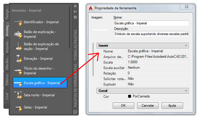 Quando uma ferramenta estiver em uma paleta de ferramentas, você pode alterar as propriedades. Por exemplo, é possível alterar a escala de inserção de um bloco ou o ângulo de um padrão de hachura.