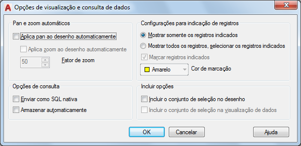 Para obter uma descrição de todas as opções disponíveis, consulte a Caixa de diálogo Opções de visualização e consulta de dados em CONECTARBD na Referência de Comandos.