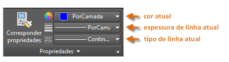 Observe que as propriedades atuais do objeto selecionado são exibidas na paleta Propriedades. É possível alterar as propriedades clicando em qualquer uma delas e alterando a configuração. A propriedade definida como “PorCamada” herda a configuração da sua camada. No exemplo anterior, os objetos que foram criados na camada 20 ELETRICO são roxos, já que é a cor padrão para os objetos daquela camada.