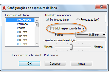 Para controlar a exibição das espessuras de linha, clique no botão Configurações de espessura de linha na parte inferior da lista de espessuras de linha. Na caixa de diálogo Configurações de espessura de linha, você pode escolher se deseja exibir ou ocultar espessuras de linha.