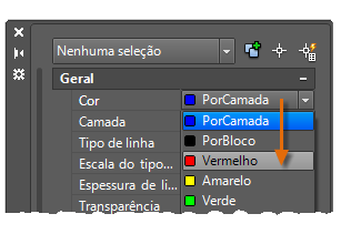 A paleta Propriedades exibe uma lista de todas as configurações de propriedades importantes. Você pode clicar em qualquer um dos campos disponíveis para alterar a configuração atual. No exemplo a seguir, se nenhum objeto for selecionado, a cor atual será alterada de PorCamada para Vermelho. Será atribuída a propriedade de cor Vermelho a todos os objetos criados subsequentemente.
