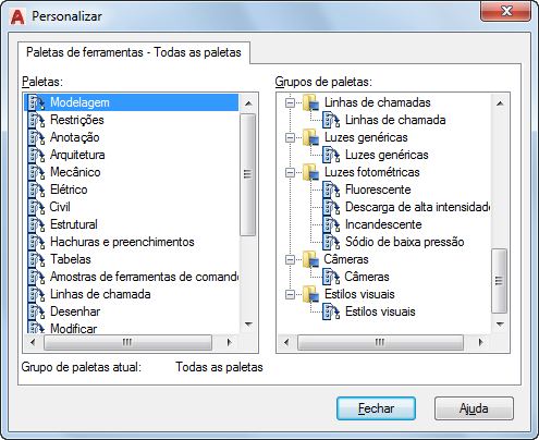 A janela Paletas de ferramentas exibe somente as paletas de ferramentas para o grupo atual ou exibe todas as paletas de ferramentas se nenhum grupo é atual.