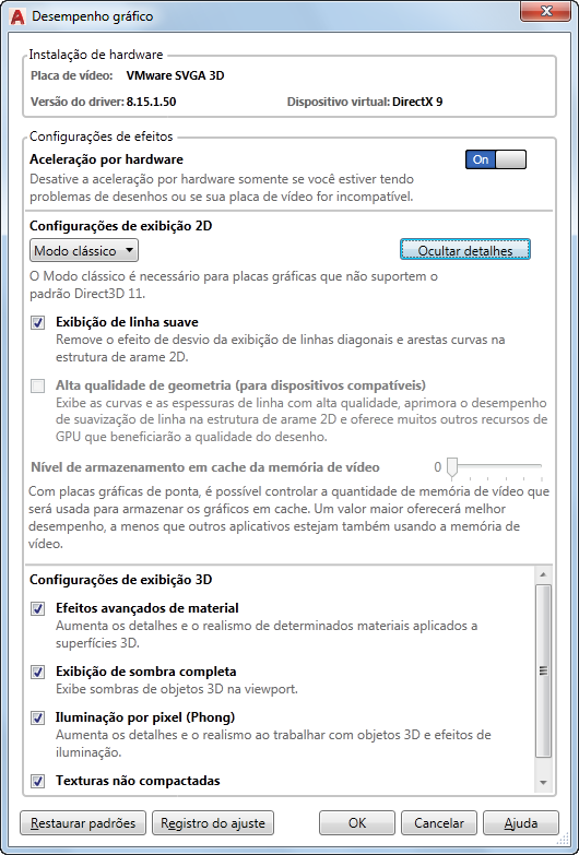 - Permite o uso da aceleração por hardware e proporciona controle de todas as configurações de efeitos disponíveis para o driver atual. Quando desativada, somente a opção Exibição de linha suave é ativada, e o modo é alterado para o modo de software padrão.