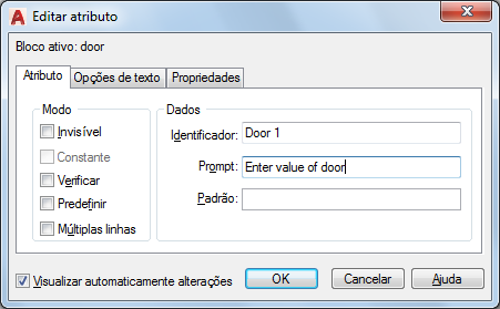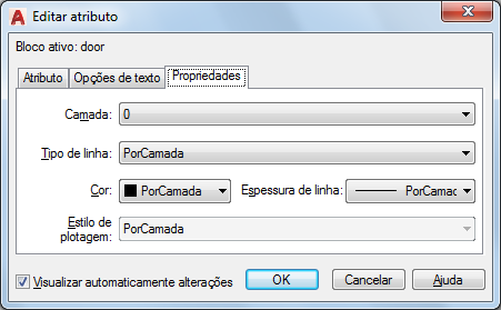 Controla se a área de desenho será imediatamente atualizada para exibir as alterações de atributo visíveis realizadas. Se Visualizar previamente automaticamente as alterações estiver selecionado, as alterações serão imediatamente visíveis. Se Visualizar previamente automaticamente as alterações estiver desmarcado, as alterações não serão visualizadas imediatamente.