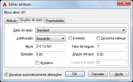 Configura as propriedades que definem a forma como o texto de um atributo é exibido no desenho. Altere a cor do texto do atributo na guia Propriedades.