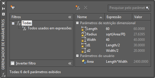As restrições de cota Comprimento e Largura são definidas como constantes. As restrições d1 e d2 são expressões simples que referenciam Comprimento e Largura. O parâmetro de restrição de cota Raio é definida como uma expressão que inclui a função de raiz quadrada, parênteses para determinar a precedências das operações, a variável do usuário Área , o operador de divisão e a constante PI. Estes parâmetros podem ser acessados no Gerenciador de parâmetros.