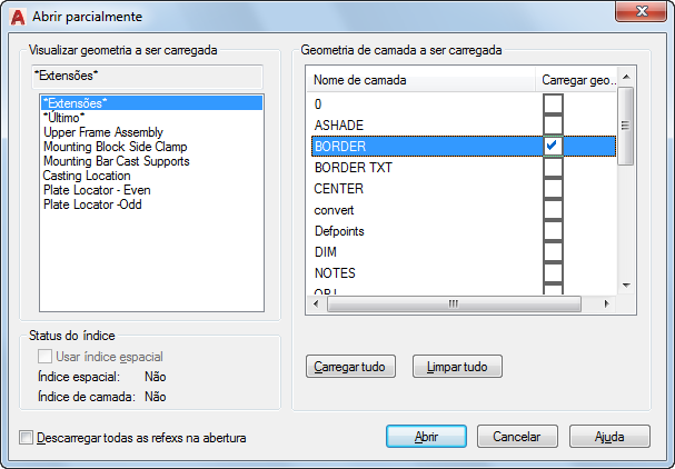 Você pode selecionar e carregar a geometria de uma vista ou área selecionada e de camadas. Não é possível descarregar nenhuma informação que esteja atualmente carregada no desenho. Se o desenho contiver refex anexadas não carregadas no momento em que o desenho foi parcialmente aberto, você poderá recarregar as refex utilizando a paleta External References. Consulte REFEX.