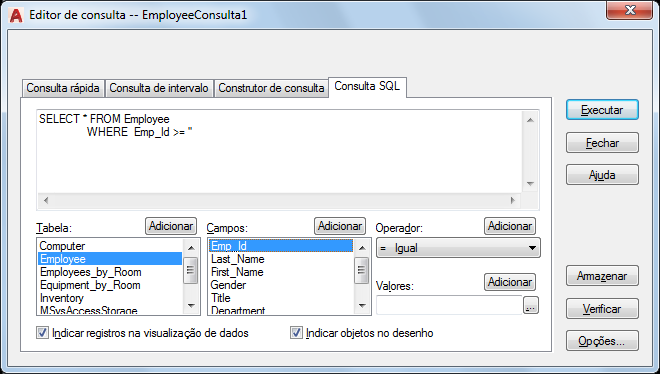 Fornece um espaço para você inserir uma consulta SQL com forma livre ou adicionar elementos selecionados utilizando diversas ferramentas de Consulta SQL.