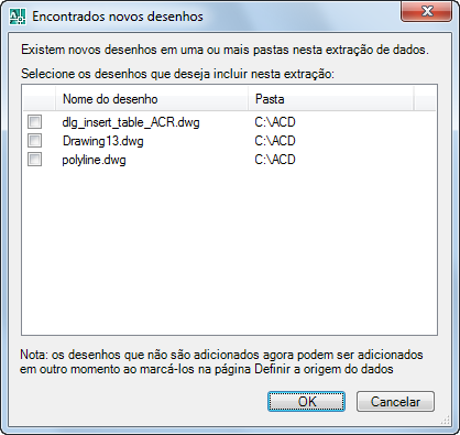 Exibe uma lista de novos desenhos adicionados à pasta selecionada para a extração dos dados, após a extração ter sido executada.