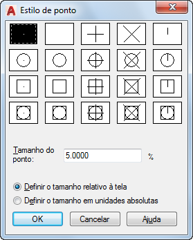 Define o tamanho da exibição do ponto. O valor inserido pode ser relativo à tela ou em unidades absolutas. O ponto exibido é armazenado na variável de sistema PDSIZE. Os objetos ponto subsequentes que você desenhar utilizarão o novo valor.