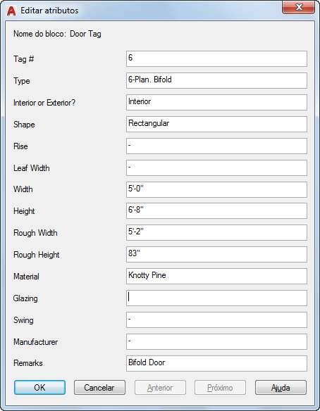 Esta caixa de diálogo altera os valores de atributos de bloco específicos. Para alterar propriedades do atributo como posição, altura e estilo, utilize -EDITARATRIB.