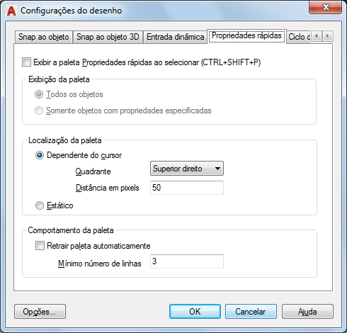 Especifica qual dos quatro quadrantes relativamente ao cursor exibirá a paleta Propriedades rápidas com relação à localização do cursor. A localização padrão é acima e à direita do cursor.