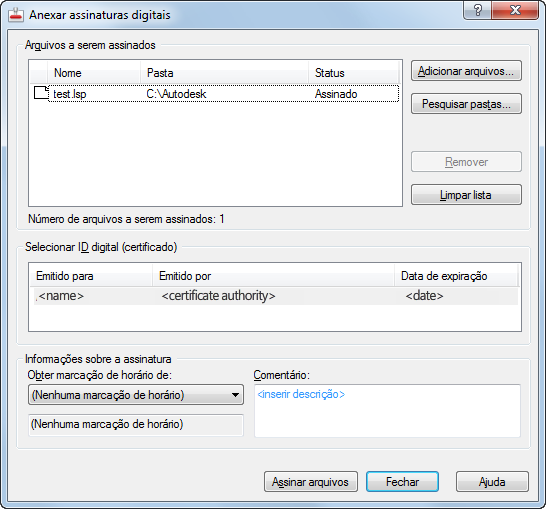 Anexa uma assinatura digital a todos os arquivos relacionados nessa caixa de diálogo.