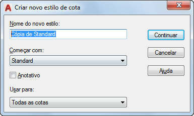 Nomeia o novo estilo de cota, define o estilo no qual iniciar um novo estilo e indica os tipos de cota aos quais você deseja que o novo estilo seja aplicado.