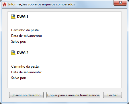 COMPAREINFO abre a caixa de diálogo Informações do desenho, que permite inserir as informações das propriedades dos dois arquivos de desenho, como uma tabela, no desenho atual ou copiar as informações para a área de transferência, como texto.