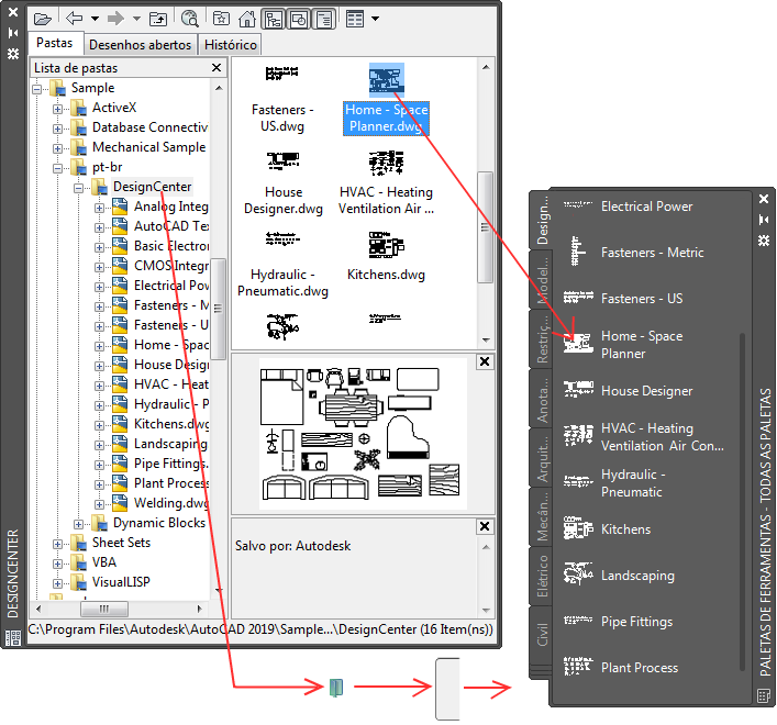 - Arraste desenhos, blocos e hachuras do DesignCenter. Os desenhos adicionados a uma paleta de ferramentas são inseridos como blocos quando arrastados até o desenho.