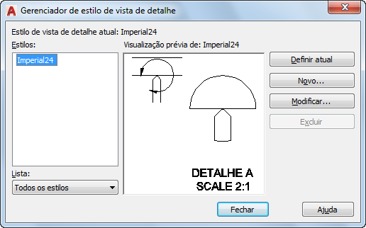 Filtra o conteúdo da lista Estilos. Clique em Todos os estilos para exibir todos os estilos de vista para detalhe disponíveis no arquivo do desenho. Clique em Estilos em uso para somente exibir os estilos de vista de detalhe que são referenciadas por vistas para detalhe no desenho atual.