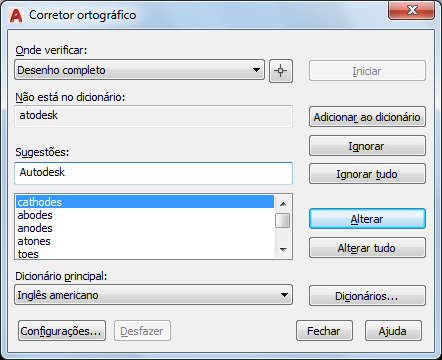 Verifica a ortografia em texto de linha única, texto com múltiplas linhas, texto de linha de chamada múltipla, texto nos atributos do bloco, texto em refex e texto adicionado em cotas.