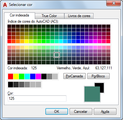É possível selecionar entre as 255 cores do Índice de cores do AutoCAD (ACI), true colors e cores do Livro de cores disponíveis em três guias.
