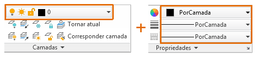 Na guia Início da faixa de opções, utilize as camadas e painéis de propriedades para verificar ou alterar as configurações para as propriedades mais comumente acessadas: camada, cor, espessura de linha e tipo de linha.