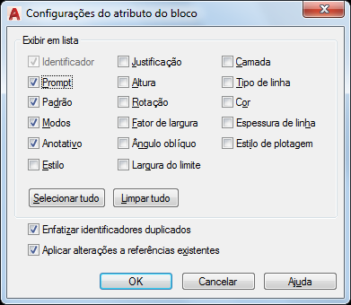 Especifica as propriedades a serem exibidas na lista de atributos. Apenas aquelas selecionadas são exibidas na lista. A propriedade do identificador está sempre selecionada.