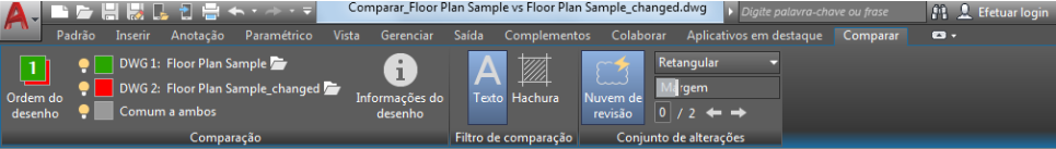 Quando você seleciona dois arquivos de desenho para comparação e clica em Comparar, a guia Comparação contextual é exibida na faixa de opções.