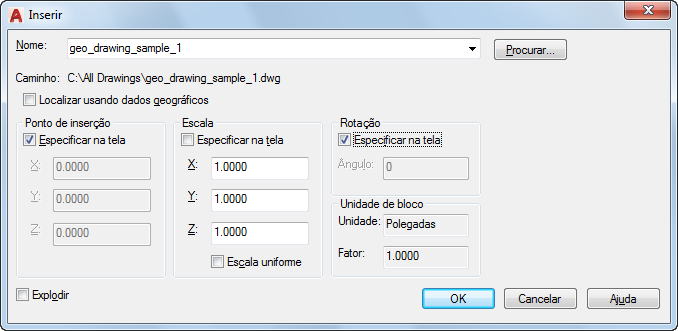 Explode o bloco e insere suas partes individuais. Quando Explode é selecionado, você pode especificar somente um fator de escala uniforme.