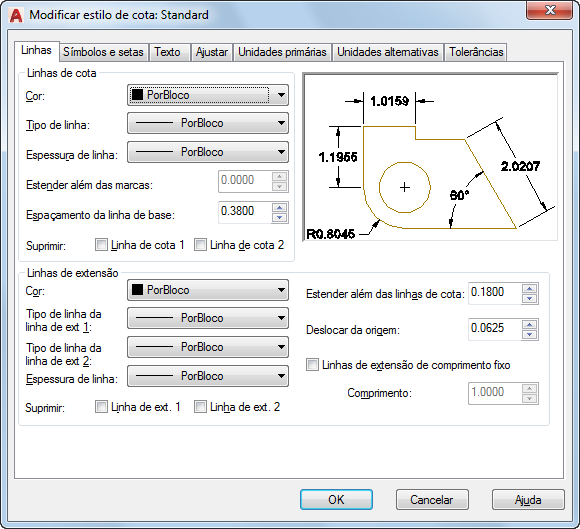 Define o formato e as propriedades das linhas de cota, linhas de extensão, pontas de seta e marcas de centro.