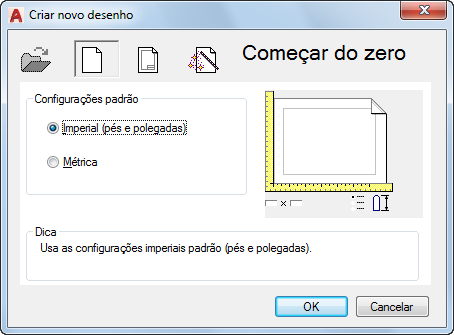Start from Scratch cria um novo desenho com as configurações padrão imperial ou métrica. Use a Template cria um novo desenho com as configurações definidas em um modelo de desenho selecionado. Use a Wizard cria um novo desenho com as configurações especificadas no assistente Quick ou Advanced. (A primeira opção, Abrir um desenho, não fica disponível a partir do comando NOVO. Para abrir um desenho existente, utilize ABRIR.)