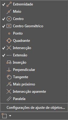 Se precisar usar um ou mais snaps a objeto repetidamente, você pode ativar os snaps a objeto em execução, que persistem em todos os comandos subsequentes. Por exemplo, você pode definir o ponto de extremidade, o meio e o centro como os snaps ao objeto em execução.