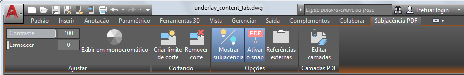 Quando você seleciona uma subjacência PDF em um desenho, a guia contextual PDF é exibida na faixa de opções.