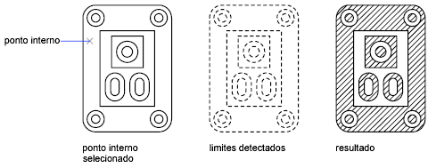 As áreas delimitadas ou objetos de texto dentro de limites de hachura são tratados comoilhas.