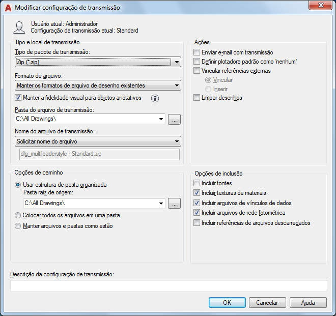Se este campo não for modificado, o arquivo de transmissão é criado na pasta que contém o arquivo de desenho especificado. Em um contexto de conjunto de folhas, o arquivo de transmissão é criado na pasta contendo o arquivo de dados de definição de folha (DST). Não se aplica ao AutoCAD LT.
