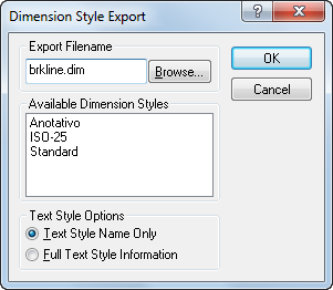 Available Dimension Styles Seleciona os estilos de cota para gravar para o arquivo ASCII. Os estilos de cota atuais são exibidos. Cada estilo selecionado é gravada no arquivo indicado no grupo Nome do arquivo de exportação.