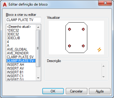 Selecione de uma lista de definições de bloco que são salvas no desenho para serem editadas no Editor de bloco. Você pode também inserir um nome para a nova definição de bloco no Editor de bloco.