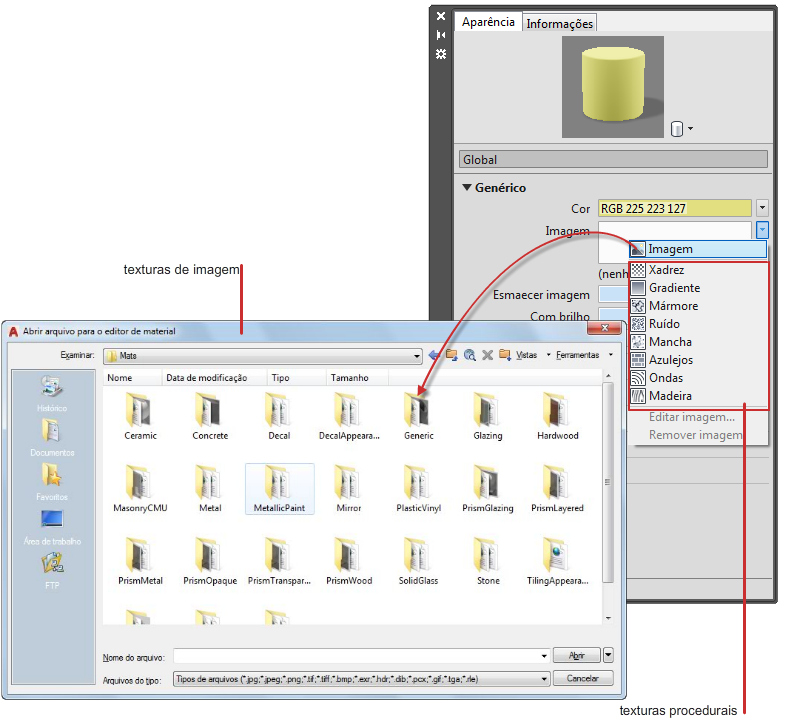 O produto fornece uma biblioteca de imagens que é possível utilizar com texturas. Você também pode adicionar suas próprias texturas com os seguintes tipos de arquivos: