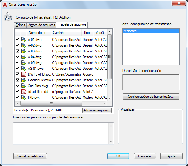 Por padrão, todos os arquivos associados ao desenho atual (como refex, estilos de plotagem e fontes relacionados) são apresentados. Você pode adicionar arquivos ao pacote de transmissão ou remover arquivos existentes. Os arquivos relacionados que são mencionados pelos URLs não são incluídos no pacote de transmissão.