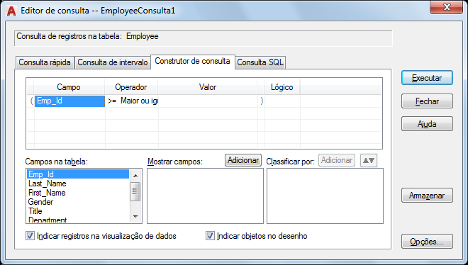 É possível também agrupar os critérios entre parênteses, selecionar quais campos devem ser exibidos na consulta retornada e especificar uma ordem de classificação para os campos.