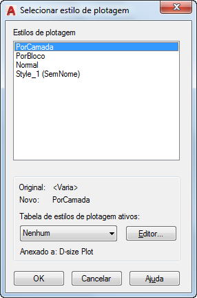 Exibe os estilos de plotagem disponíveis, incluindo o estilo de plotagem padrão, NORMAL. Um estilo de plotagem é um conjunto de configurações de propriedade utilizadas na plotagem.