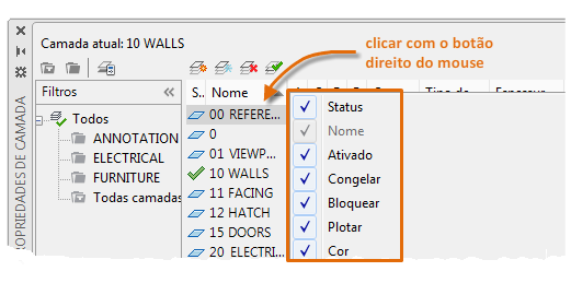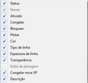 Lista todas as colunas por nome. Uma marca de verificação indica que a coluna está incluída na exibição. Clique em um nome de coluna para mostrar ou ocultar a coluna. VP Freeze, VP Color, VP Linetype, VP Lineweight e Estilo de plotagem VP somente estão disponíveis quando a viewport de layout está ativa.