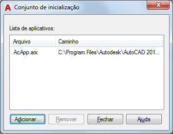 Adiciona e remove arquivos de aplicativo do Conjunto de inicialização. Esses aplicativos são carregados sempre que você inicia o AutoCAD.