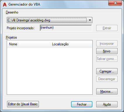 Exibe a caixa de diálogo Abrir Projeto VBA (consulte CARRVBA), na qual você pode carregar um projeto existente na sessão de trabalho atual.